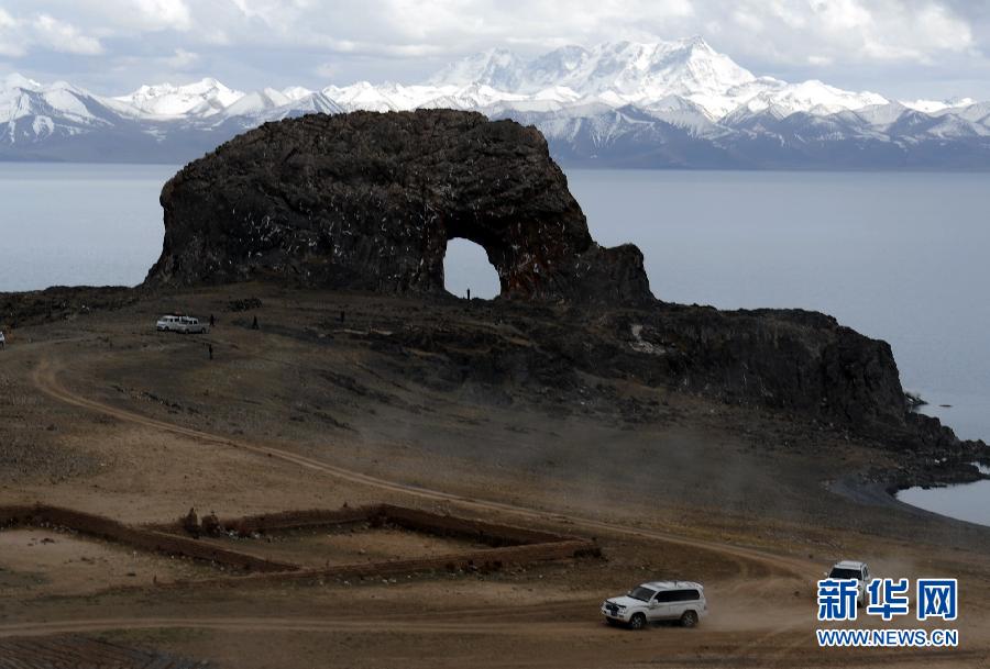 这是纳木错的“圣象天门”景点(5月20日摄)。随着天气回暖,西藏纳木错湖面已全面解冻,也进入了旅游旺季,很多游客来此领略壮阔的“天湖”美景。纳木错位于西藏羌塘草原南部,湖面海拔4722米,是世界上海拔最高的咸水湖,也是藏传佛教的圣湖之一。2014年,纳木错景区共接待国内外游客71万人次。新华社记者 唐召明 摄