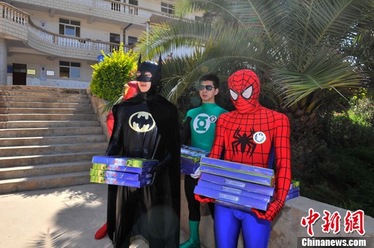 5月29日,在六一儿童节来临之际,祥鹏航空的安全员变身超级英雄,来到云南省昆明市晋宁县的学校,为长期资助的困难学生送上儿童节礼物。中新社发 刘冉阳 摄