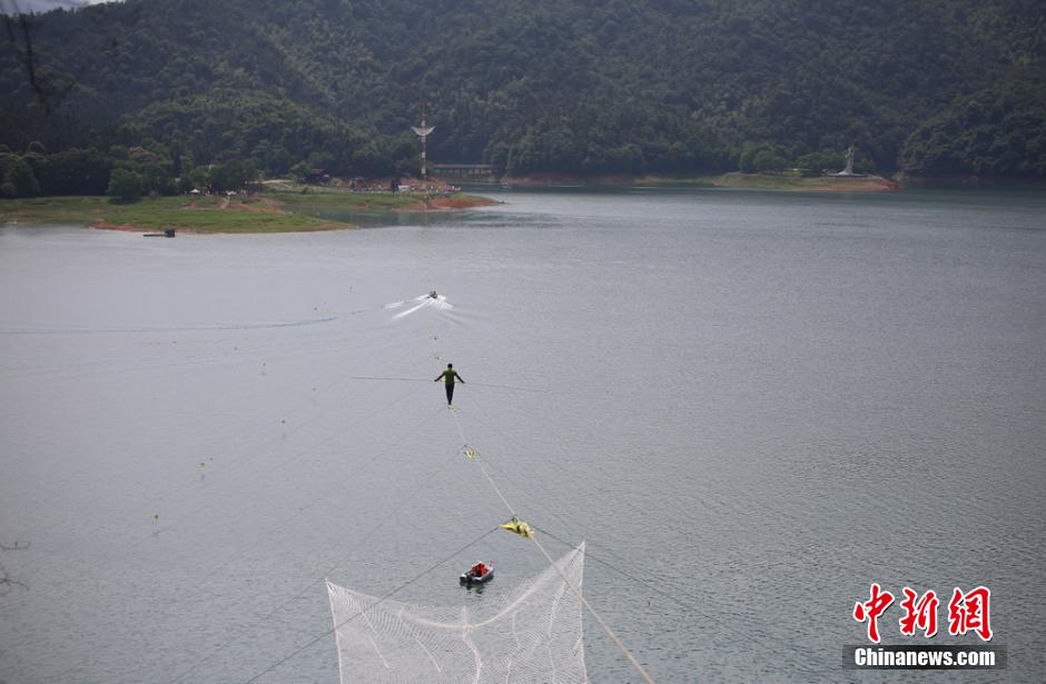 5月29日,“壮志雄心·全球走钢丝大赛”在湖南株洲攸县酒埠江风景区开赛。有“欧洲高空钢索之王”之称的瑞士老将弗雷迪·诺克从参赛选手中脱颖而出,夺得“直走竞速”赛事的冠军。此次大赛为期三天,分为“直走竞速”、“倒走竞速”和“蒙眼倒走竞速”三场比赛,吸引了来自中国、瑞士和俄罗斯的七名走钢丝高手参加,其中包括两名女选手。胡剑 摄