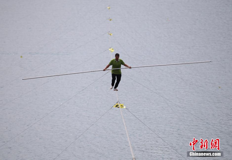 5月29日,“壮志雄心·全球走钢丝大赛”在湖南株洲攸县酒埠江风景区开赛。有“欧洲高空钢索之王”之称的瑞士老将弗雷迪·诺克从参赛选手中脱颖而出,夺得“直走竞速”赛事的冠军。此次大赛为期三天,分为“直走竞速”、“倒走竞速”和“蒙眼倒走竞速”三场比赛,吸引了来自中国、瑞士和俄罗斯的七名走钢丝高手参加,其中包括两名女选手。胡剑 摄
