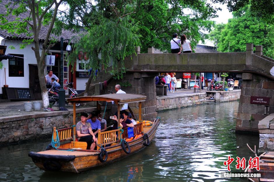 5月29日,游客乘船游览江南古镇朱家角风光。朱家角素有上海威尼斯、沪郊好莱坞之誉,又名珠街阁,雅称珠溪,俗称“角里”,原名朱家村。座落于上海市青浦县,黄金水道槽港河穿镇而过,水陆交通便捷,风景优美,物产丰裕,是上海保存最完整的江南水乡古镇。1991年被上海市政府命名为四大历史文化名镇之一。朱家角历史悠久,民风淳朴,文化积淀深厚,早在五千年前的良渚时期,就有人类活动;早在1700多年前的三国时期,便已有村落集市;明朝万历年间已成为商贾云集、烟火千家的繁华集镇。现在仍可看到古色古香的明清时期街市、建筑和水乡泽国古朴的风土民情,处处散发着浓郁的文化韵味。中新社发 张畅 摄