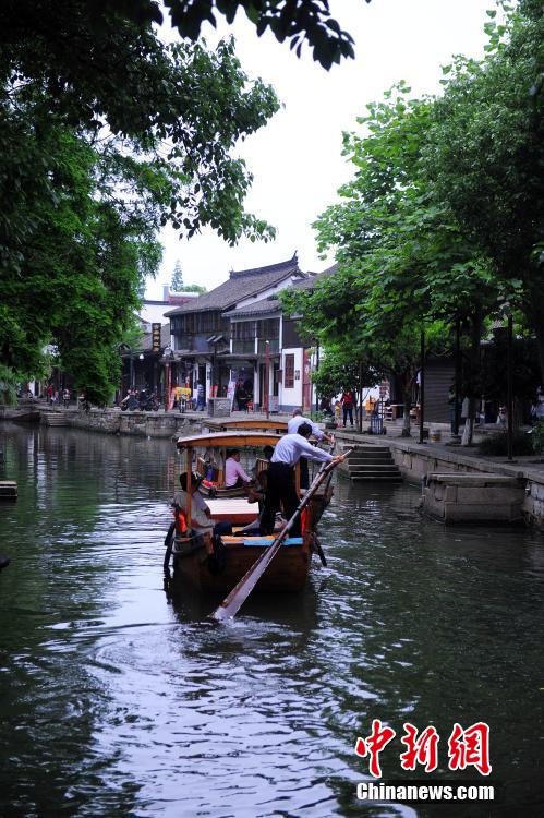 5月29日,游客乘船游览江南古镇朱家角风光。朱家角素有上海威尼斯、沪郊好莱坞之誉,又名珠街阁,雅称珠溪,俗称“角里”,原名朱家村。座落于上海市青浦县,黄金水道槽港河穿镇而过,水陆交通便捷,风景优美,物产丰裕,是上海保存最完整的江南水乡古镇。1991年被上海市政府命名为四大历史文化名镇之一。朱家角历史悠久,民风淳朴,文化积淀深厚,早在五千年前的良渚时期,就有人类活动;早在1700多年前的三国时期,便已有村落集市;明朝万历年间已成为商贾云集、烟火千家的繁华集镇。现在仍可看到古色古香的明清时期街市、建筑和水乡泽国古朴的风土民情,处处散发着浓郁的文化韵味。中新社发 张畅 摄