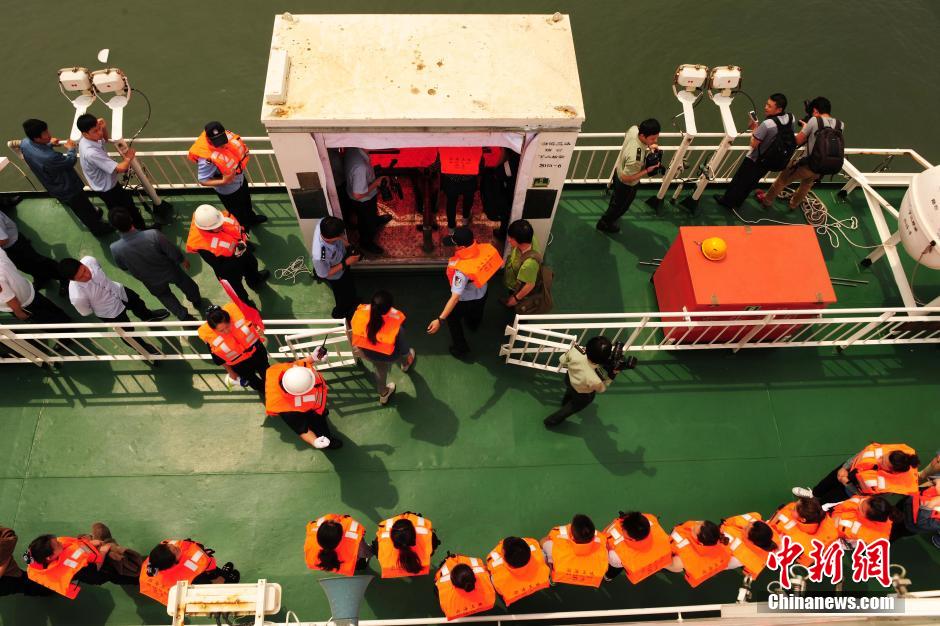 6月2日,烟台市海上搜救中心举行大规模客滚船综合应急演习,演练了客滚船灭火自救、岸基消防支援、旅客码头疏散等科目。参加演练的人员还在船员的引导下进行了模拟弃船逃生演习,通过救生艇、垂直撤离系统等有序离船。图为旅客通过垂直撤离系统弃船。 李敏 摄