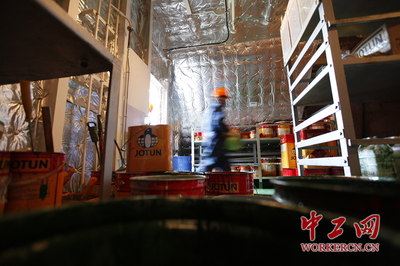 船舶油漆是船上物料开支的大头,船用油漆不仅种类繁多,而且特性各有不同,不同的场合需要不同的油漆,卢丰在油漆调配和管理上都有自己的绝招,他所工作过的每艘船舶,不仅船舶甲板机械的保养做得比其它船舶好,和同类型船舶相比每年都能节约百分之三十的油漆。图为卢丰正在搬运油漆。中工网记者韩靖摄