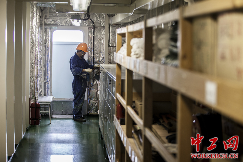 集装箱船舶在卸载集装箱过程中,经常会碰到钮锁打不开而影响卸货速度的事情。卢丰经过反复琢磨和思考,自行设计了一套切实可行的开锁方法,赢得了同行们的高度赞扬,国外的码头工人也都非常钦佩他的这套“开锁”方法。图为卢丰正在修理钮锁。中工网记者韩靖摄