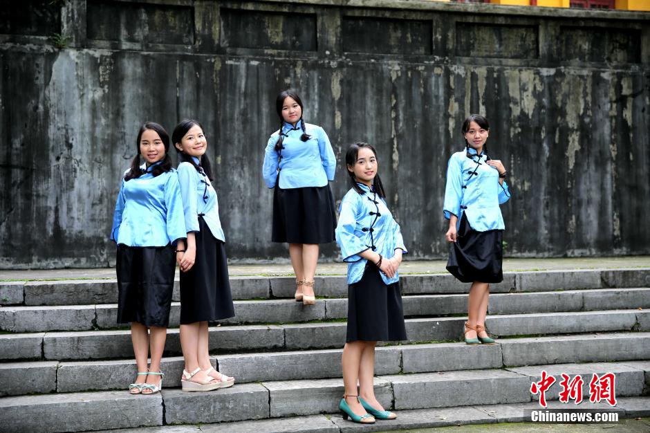 图为学生身着五四校服拍摄毕业照。裴蕾 摄