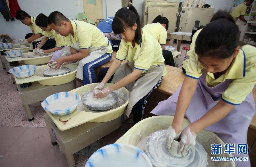 6月3日,河北省张家口市宣化一中的高三学生通过体验陶器制作放松心情。高考在即,张家口宣化一中在校园内开设宣泄间、音乐放松室、沙盘游戏厅、心理疏导屋、陶吧和游戏角等组成考前“减压沙龙”,并配备心理疏导教师为考生进行一对一或团体辅导,帮学生缓解压力,轻松迎考。新华社发(陈晓东 摄)