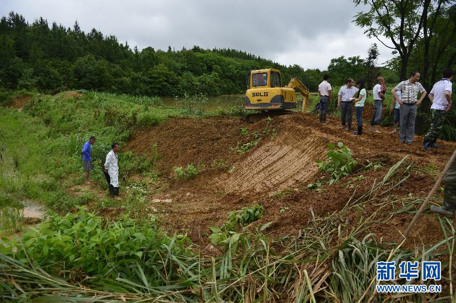 6月3日,乡镇干部与村民在乐平市镇桥镇墩上村一处发生险情的水渠圩堤上进行加固抢修。 6月2日晚开始,一轮强降雨袭击了江西省乐平市。从2日20点到3日6点,乐平市平均降雨量达150mm,其中镇桥镇降雨量达300mm。作为江西省最主要的蔬菜产区,乐平市共有4.5万亩蔬菜被淹,菜农损失严重。新华社记者周密摄