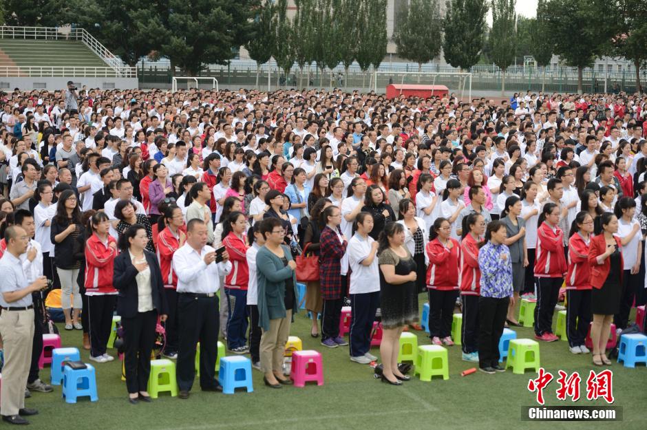 6月3日,学生与家长面向国旗,手放胸前。当日已经离高考时间不到一周,呼和浩特市第一中学老师、高三学生与家长共聚毕业典礼,感恩今天,为高考加油。 中新社发 刘文华 摄