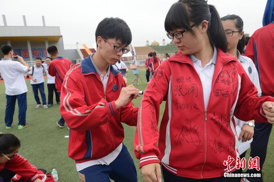 6月3日,毕业典礼现场,一位学生让同学把名字签在校服上。当日已经离高考时间不到一周,呼和浩特市第一中学老师、高三学生与家长共聚毕业典礼,感恩今天,为高考加油。 中新社发 刘文华 摄