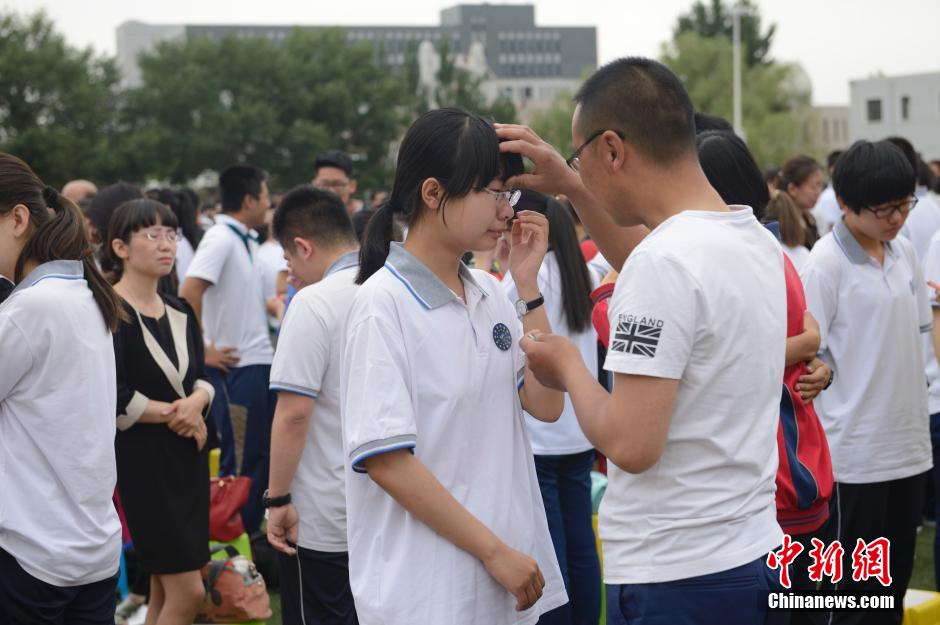 6月3日,毕业典礼现场,一位学生无法向没有到场的家长说“我爱你”,开始坚持没有哭,老师上前安慰瞬间泣不成声。当日已经离高考时间不到一周,呼和浩特市第一中学老师、高三学生与家长共聚毕业典礼,感恩今天,为高考加油。 中新社发 刘文华 摄