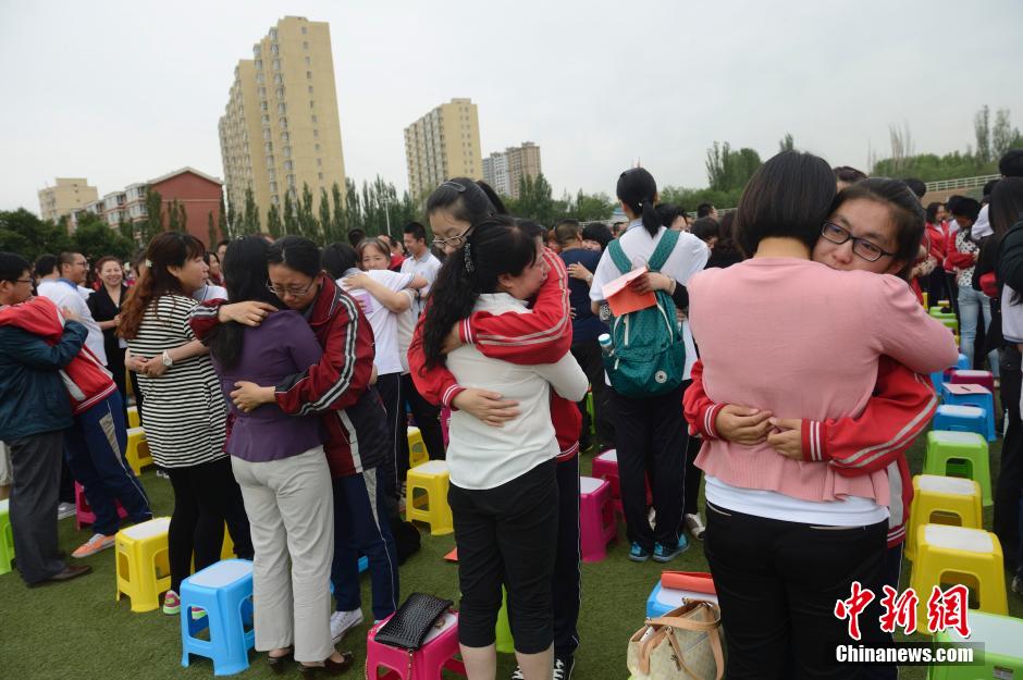 6月3日,毕业典礼现场,一位学生无法向没有到场的家长说“我爱你”,开始坚持没有哭,老师上前安慰瞬间泣不成声。当日已经离高考时间不到一周,呼和浩特市第一中学老师、高三学生与家长共聚毕业典礼,感恩今天,为高考加油。 中新社发 刘文华 摄