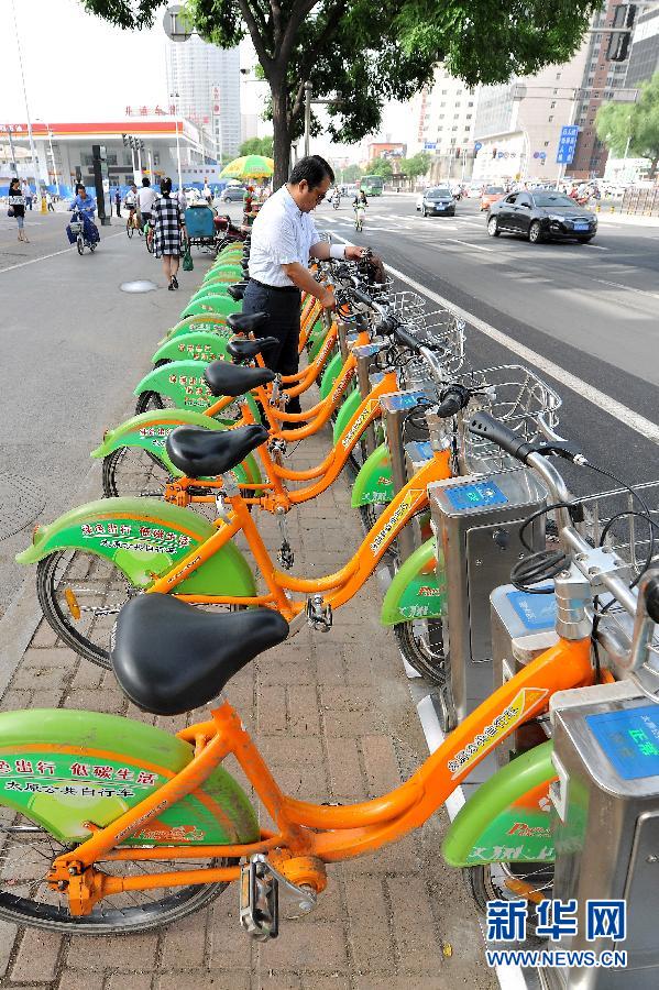 6月5日,市民在太原市一处公共自行车租赁点取车。当日是世界环境日,在山西省太原市,许多市民选择公共自行车这种绿色的方式出行,响应环境日“践行绿色生活”的主题。据悉,太原的公共自行车起步于2012年9月。目前,太原公共自行车已经投放4.1万辆,1200多个服务站点遍布全市的大街小巷,成为城市的一道独特风景。新华社记者 詹彦 摄