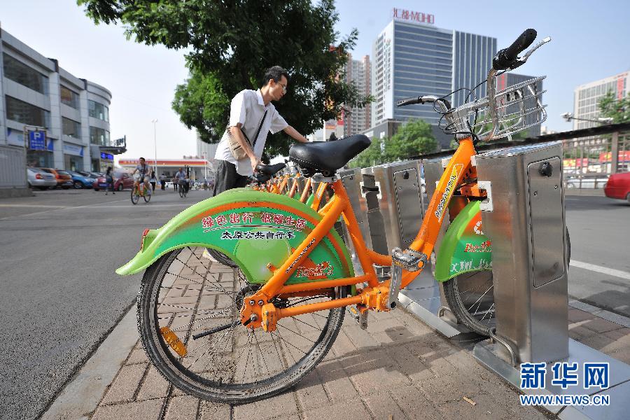 6月5日,市民在太原市一处公共自行车租赁点取车。当日是世界环境日,在山西省太原市,许多市民选择公共自行车这种绿色的方式出行,响应环境日“践行绿色生活”的主题。据悉,太原的公共自行车起步于2012年9月。目前,太原公共自行车已经投放4.1万辆,1200多个服务站点遍布全市的大街小巷,成为城市的一道独特风景。新华社记者 詹彦 摄