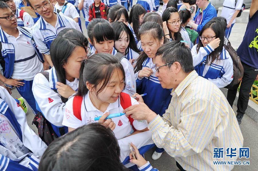 6月5日,长春市十一高中校长朱杰在学生校服上写下鼓励的话语。当日距2015年高考还有两天,吉林省长春市十一高中为学生们举行毕业典礼。毕业典礼上,高一、高二的学生和全校老师为即将毕业参加高考的学生们加油鼓劲,祝愿他们考出好成绩。新华社记者 张楠 摄