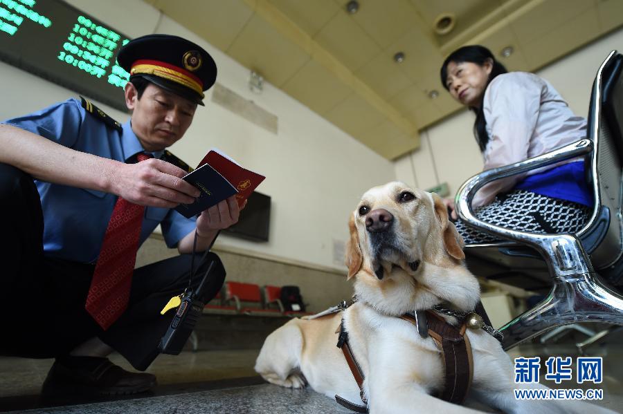 6月5日,在兰州火车站,铁路工作人员查看导盲犬ECO的相关证件。当日,兰州盲人夫妇常建荣、李红颜携带导盲犬ECO从兰州火车站乘坐D2753次动车前往嘉峪关,这是铁路总公司5月1日正式实施残障旅客携带导盲犬进站乘车规定以来,兰新高铁首次迎来携带导盲犬进站乘车的视力残障旅客。兰州铁路局在购票、进站、乘车等方面采取了一系列服务措施,为这对携带导盲犬的盲人夫妇乘车创造无障碍的出行条件。新华社记者 范培珅 摄