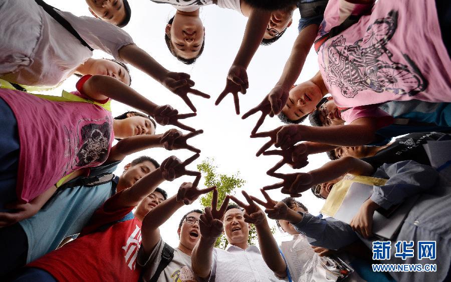 6月7日,在河北省邯郸市第一中学考点外,老师和考生们摆出胜利的手势加油鼓劲。当日,2015年高考拉开帷幕,全国共有942万考生报名参加高考。 新华社发(郝群英 摄)