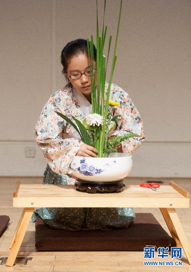 6月7日,一名北京大学学生在“新六艺”教学成果展示活动现场表演花道。当日,北京大学第二届“新六艺”教学成果展示活动在北大百周年纪念讲堂举行。来自北大的师生共同演绎了包括汉字太极、吟诵、花道、茶道、香道、琴道在内的六门“新旧”结合的艺术门类。据了解,北京大学体育部养生文化研究中心根据新时代高校学生的修身养性、学艺求道的要求,在传统的“礼乐射御书数”六艺的基础上,打造出“新六艺”课程,通过这种途径让学生更好地接受传统文化教育。新华社记者 陈君清 摄
