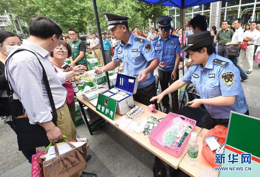 6月7日,在南京市第九中学考点门前的“城管护考”服务点,城管队员向考生免费赠送考试文具、药品等应急用品。当日是2015年高考第一天。在家长满怀期待、考生走进考场的背后,同样有不少爱心人士在默默忙碌,为考生“保驾护航”。 新华社记者孙参摄