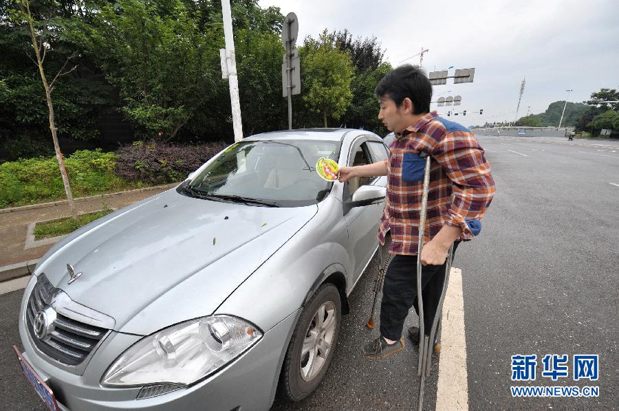为了帮助广大考生,长沙市残疾人爱心车队组织车辆举行爱心送考活动,参与爱心送考的长沙残疾人驾驶员卜峰出发前为车辆张贴送考绿色通行证(6月7日摄)。当日是2015年高考第一天。在家长满怀期待、考生走进考场的背后,同样有不少爱心人士在默默忙碌,为考生“保驾护航”。 新华社记者 龙弘涛摄