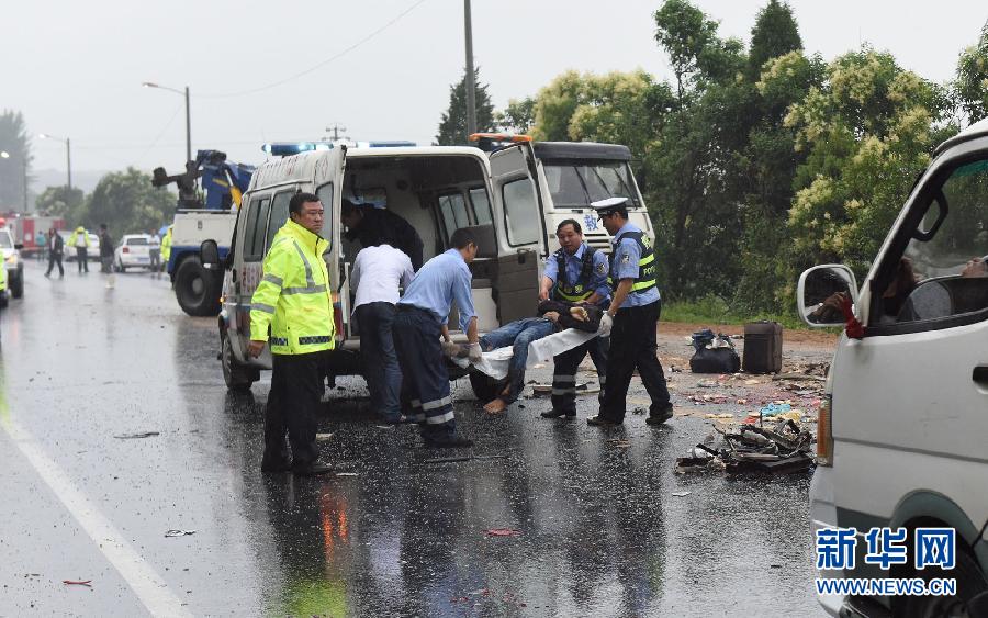 6月7日,在湖北省孝感市交通事故现场,交警在抢救受伤乘客。
