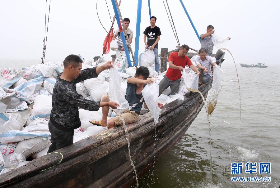 6月8日,苗种场工人在江苏省连云港市海州湾渔场增殖放流中国对虾。