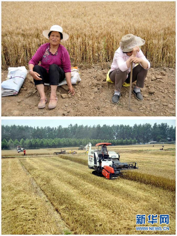 这是一张拼版照片:6月8日,在山东省临沂市郯城县马头镇高大三村麦田边,两名妇女等待装运小麦(上图);6月8日,收割机在山东省临沂市郯城县马头镇高大三村的麦田里收割小麦(下图)。