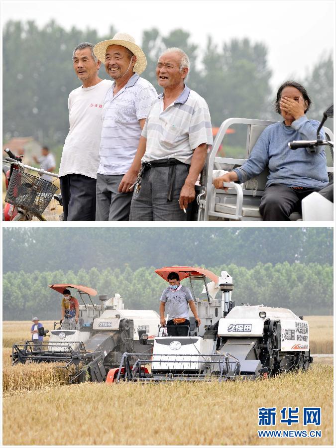 这是一张拼版照片:6月8日,农民在山东省临沂市郯城县马头镇高大三村麦田边看着收割机在麦田里作业(上图);6月8日,两台收割机在山东省临沂市郯城县马头镇高大三村的麦田里收割小麦(下图)。新华社发(房德华 摄)