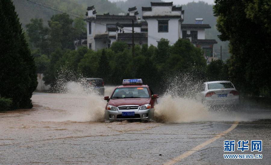 6月8日,在安徽省黄山市,车辆在积水路段行驶。当日,我国南方大部分地区的强降雨仍在继续,贵州东南部、广西北部、江西东北部、浙江西部等地的局部地区出现大暴雨,并伴有雷暴等强对流天气。新华社发(施广德 摄)