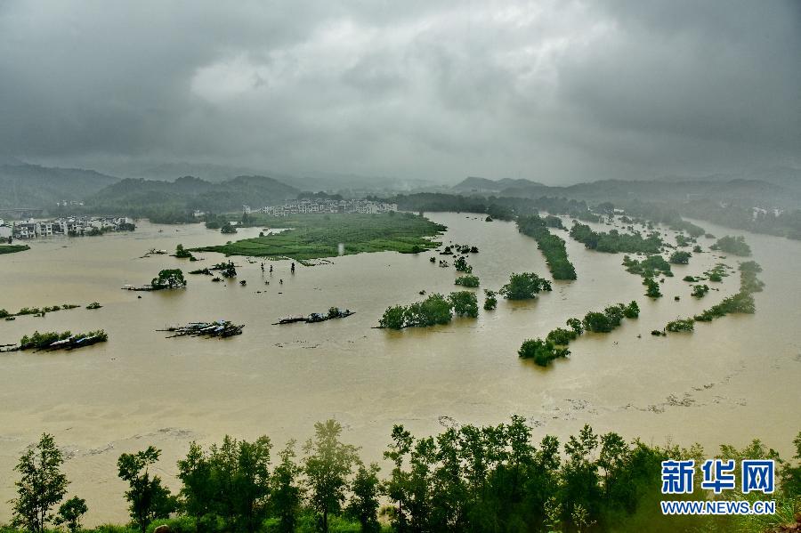 6月8日,江西婺源月亮湾景区被洪水部分淹没。当日,我国南方大部分地区的强降雨仍在继续,贵州东南部、广西北部、江西东北部、浙江西部等地的局部地区出现大暴雨,并伴有雷暴等强对流天气。新华社发(胡红平 摄)