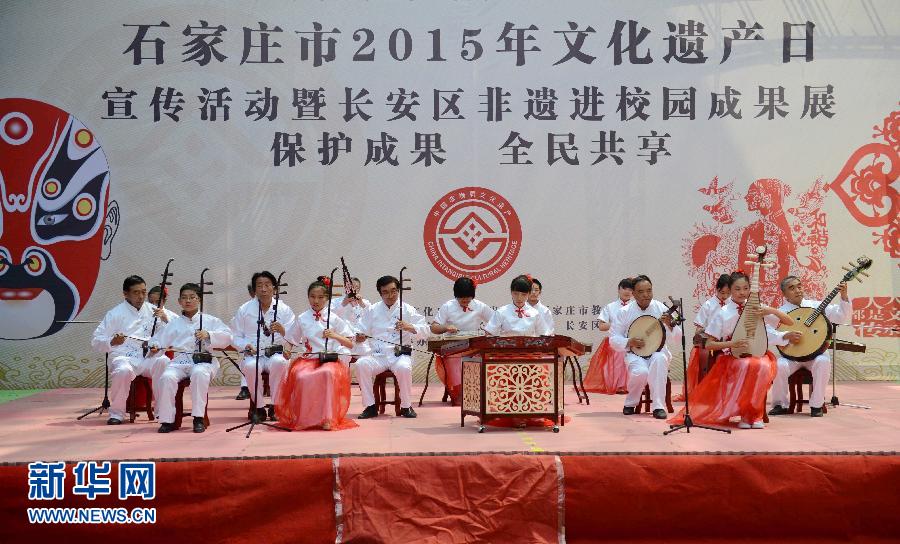 6月9日,石家庄市北师大附属学校师生在表演古乐。当日,河北石家庄市长安区举行非物质文化遗产展演活动,迎接2015年文化遗产日的到来。今年文化遗产日的主题为“保护成果 全民共享”。新华社记者 王晓摄