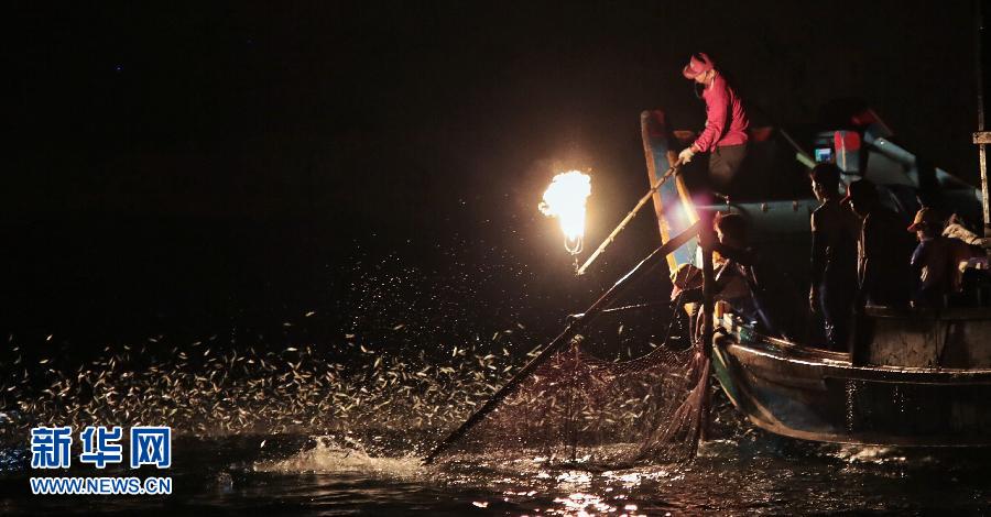 渔民在新北市金山区磺港附近海上点燃磺火捕鱼(6月8日摄)。金山磺火捕鱼是台湾留存下来的古老捕鱼方式,渔民利用磺石遇水产生易燃性气体的特点,将磺石点燃后产生强大火光,吸引趋光性强的青鳞鱼等,然后把火迅速拉高,鱼群随着火光集体往上跳跃,船员抓住时机用网捕捞鱼群。数十年前这种磺火捕鱼船有数百艘,目前仅存4艘。新华社记者才扬摄