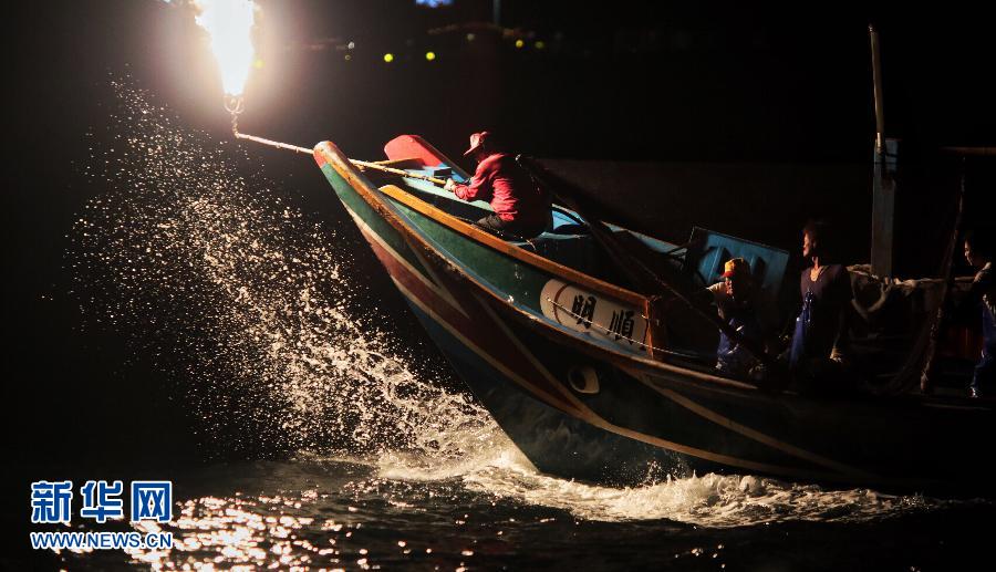 渔民在新北市金山区磺港附近海上点燃磺火吸引鱼群(6月8日摄)。金山磺火捕鱼是台湾留存下来的古老捕鱼方式,渔民利用磺石遇水产生易燃性气体的特点,将磺石点燃后产生强大火光,吸引趋光性强的青鳞鱼等,然后把火迅速拉高,鱼群随着火光集体往上跳跃,船员抓住时机用网捕捞鱼群。数十年前这种磺火捕鱼船有数百艘,目前仅存4艘。新华社记者才扬摄