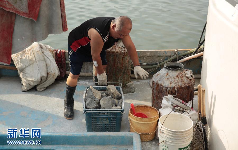 渔民在出海前装载磺石(6月8日摄)。金山磺火捕鱼是台湾留存下来的古老捕鱼方式,渔民利用磺石遇水产生易燃性气体的特点,将磺石点燃后产生强大火光,吸引趋光性强的青鳞鱼等,然后把火迅速拉高,鱼群随着火光集体往上跳跃,船员抓住时机用网捕捞鱼群。数十年前这种磺火捕鱼船有数百艘,目前仅存4艘。新华社记者才扬摄