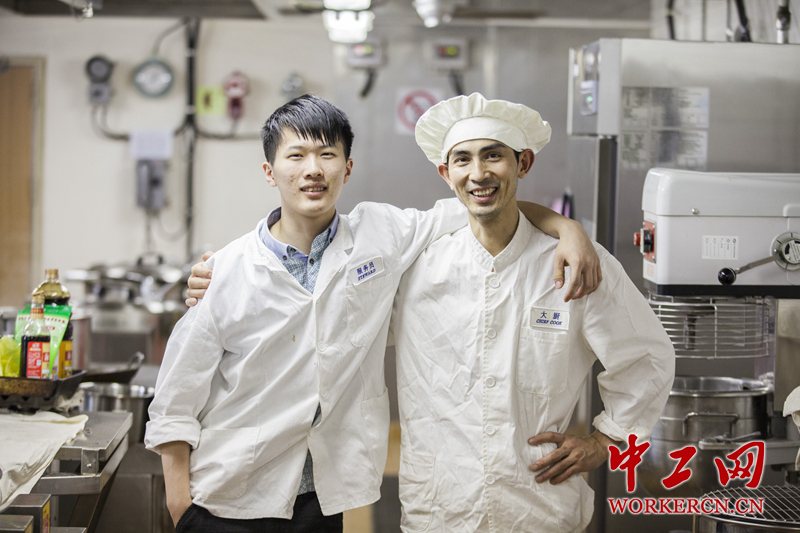 大厨刘敏(右),35岁,安徽人。服务员周朝辉(左)20岁,浙江人。 中工网记者 韩靖摄