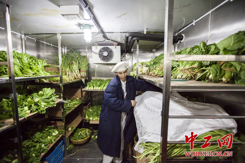 对于海员来说,绿色蔬菜非常宝贵。在蔬菜储藏室里,大厨细心地用布盖住蔬菜来保持水分,尽量让蔬菜储存得长久一些。 中工网记者 韩靖摄