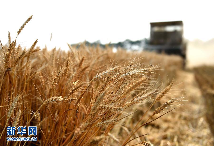 6月10日,安徽省亳州市谯城区赵桥乡王寨村农民在收获小麦。记者10日从农业部获悉,截至目前,全国已收获冬小麦19546万亩,超过播种面积50%,夏收小麦进度总体过半。当日投入联合收割机47.3万台,日机收小麦2398万亩,机收比例达89%。当前,我国华北、黄淮海各小麦主产省相继开镰,全国小麦跨区机收工作由南到北梯次推进,“三夏”生产进入高潮。新华社发(刘勤利 摄)