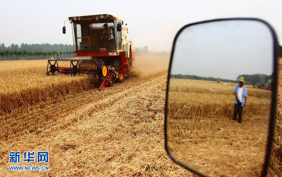 一辆联合收割机在山东省枣庄市山亭区山城街道一处麦田里作业(6月9日摄)。记者10日从农业部获悉,截至目前,全国已收获冬小麦19546万亩,超过播种面积50%,夏收小麦进度总体过半。当日投入联合收割机47.3万台,日机收小麦2398万亩,机收比例达89%。当前,我国华北、黄淮海各小麦主产省相继开镰,全国小麦跨区机收工作由南到北梯次推进,“三夏”生产进入高潮。新华社发(张强 摄)