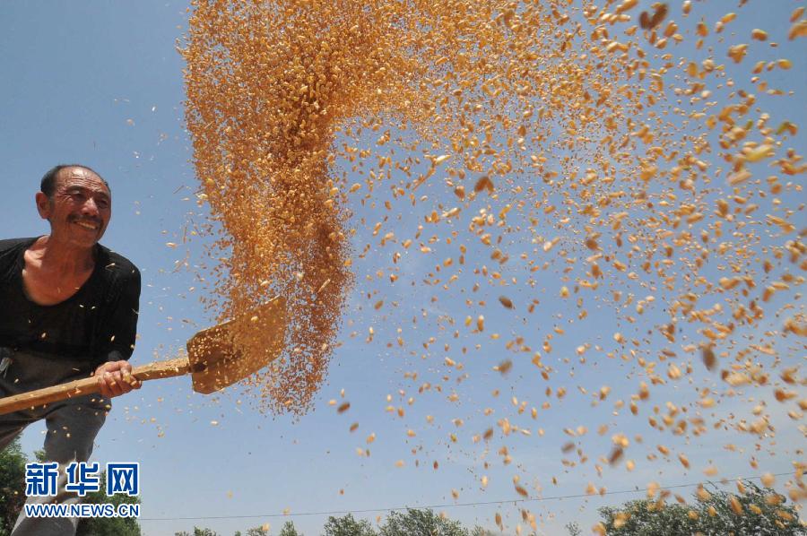 山西省运城市新绛县龙兴镇侯庄村农民王金龙抓紧晾晒收获的小麦(6月9日摄)。记者10日从农业部获悉,截至目前,全国已收获冬小麦19546万亩,超过播种面积50%,夏收小麦进度总体过半。当日投入联合收割机47.3万台,日机收小麦2398万亩,机收比例达89%。当前,我国华北、黄淮海各小麦主产省相继开镰,全国小麦跨区机收工作由南到北梯次推进,“三夏”生产进入高潮。新华社发(高新生 摄)