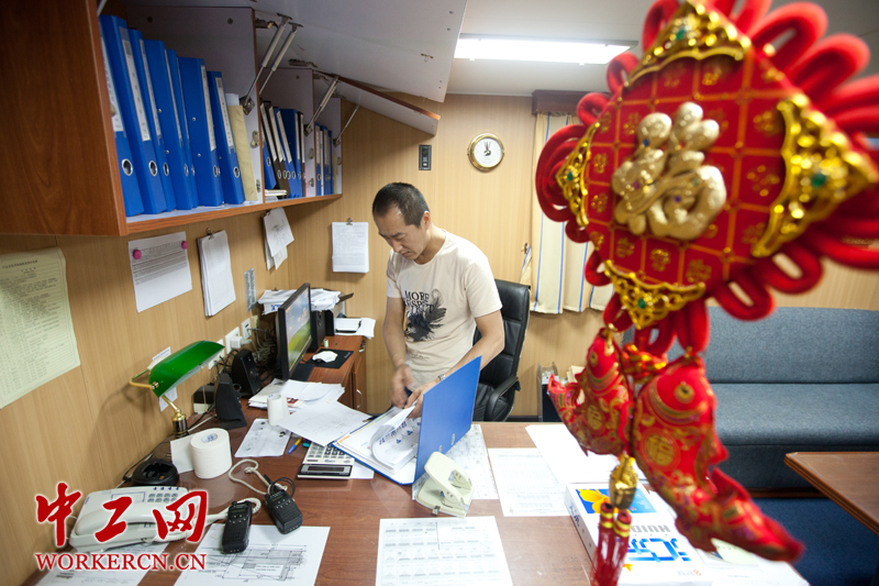 上面的柜子里全是大副的工作台帐,谢功礼说,还有好多电子表格要做,看不到的,都在电脑里。做台帐累时,他一抬头就看得到办公桌的左上方的“福”字。 中工网记者 李雪峰摄