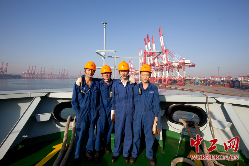 谢功礼说,越是风平浪静的大海,越是有可能暗藏着危机,谁也不能预测下一秒会发生什么。作为一名驾驶员,在面对突发情况时必须冷静果断,还要预先设计好多种应对方案。2011年,谢功礼的妻子怀孕时,他正在地中海航线出海。正直利比亚战乱,船舶突然接到通知要改航撤侨。靠港时,炮弹就落在不远处,岸上的侨胞看到船上的国旗激动不已,有的甚至哭成一片。谢功礼一边担心家中的妻子,一边还关注着侨胞和船员的安危,手心紧张得一直出汗。当船舶安全驶离港口,看到侨胞脸上感激的泪水,他更加坚定了自己在这条路上走下去的信念。图为大副与几位海员在船头合影。 中工网记者 李雪峰摄