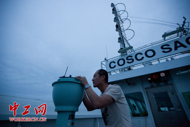 方位仪是船员常用的一件仪器,它们装在罗经上,用它对准目标,便可方便地测得目标方位。大副说,自己的休息时间跟别人都不一致,因此很少参与其他船员之间诸如打牌等不多的“集体活动”。他喜欢站在高处看海。谢功礼说,不知道会来拍照,很遗憾没穿大副制服。平日里除非必要,他也很少穿着制服,因为总需要到甲板上去干活,不方便,也不舍得穿。 中工网记者 李雪峰摄