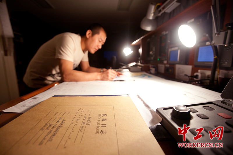 大副在航海图上标注航向,旁边就是航海日志,上面记录着船舶情况和航行情况,每天都需要认真记录。 中工网记者 李雪峰摄