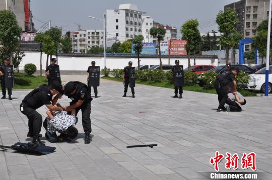6月11日下午,为使学校师生熟练掌握应对暴力侵害事件的行动步骤、撤离路线及疏散方法,湖北枝江组织70余名公安民警、消防官兵、安保队员、医护人员,在该市丹阳小学和当地2000名师生一起进行了一场应急处置演练。演练中,两“歹徒”手持凶器翻越围墙进入校园追砍学生,学校保卫人员通过监控发现警情,及时按响“一键式”校园报警器。护校队持防爆棍、钢叉对“歹徒”进行阻拦,教师组织学生有序疏散,关闭门窗。随后,20名防爆处突队员赶赴现场,使用防爆枪、警棍、催泪器、钢叉将“歹徒”逼至空旷处将其成功抓捕。与此同时,治安民警赶赴现场进行外围警戒、消防官兵、医护人员紧急出动应对突发情况,全体师生安全有序撤离至教室。