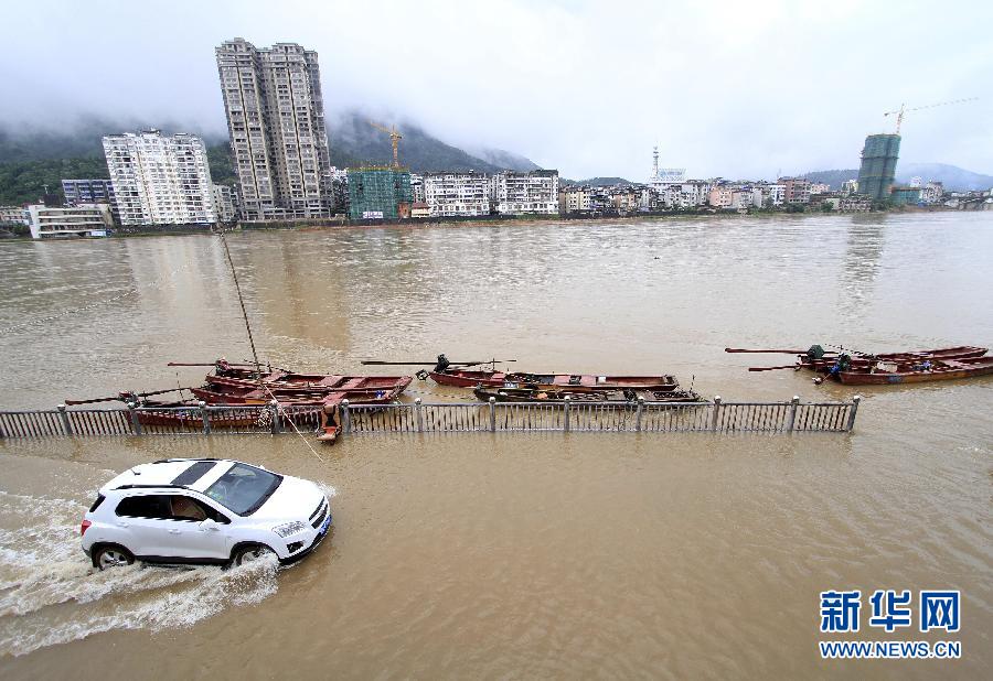 6月11日,一辆汽车涉水行进在福建省南平市顺昌县被洪水淹没的江滨路。当日,受强降雨影响,福建省南平市顺昌县遭受闽江支流富屯溪和金溪洪水的袭击,顺昌县境内部分居民住宅和公共设施被淹。当地已启动应急预案,以降低洪水造成的损失。新华社发(陈柏材 摄)