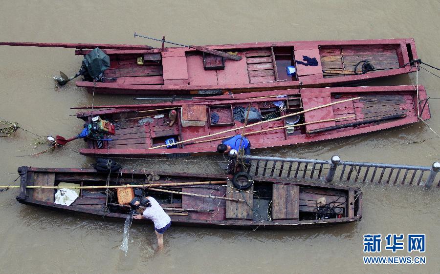6月11日,福建省南平市顺昌县渔民转移渔船,防止被洪水冲走。当日,受强降雨影响,福建省南平市顺昌县遭受闽江支流富屯溪和金溪洪水的袭击,顺昌县境内部分居民住宅和公共设施被淹。当地已启动应急预案,以降低洪水造成的损失。新华社发(陈柏材 摄)