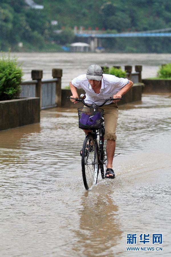6月11日,福建省南平市顺昌县一名男子骑车涉水经过被洪水淹没的江滨路。当日,受强降雨影响,福建省南平市顺昌县遭受闽江支流富屯溪和金溪洪水的袭击,顺昌县境内部分居民住宅和公共设施被淹。当地已启动应急预案,以降低洪水造成的损失。新华社发(陈柏材 摄)