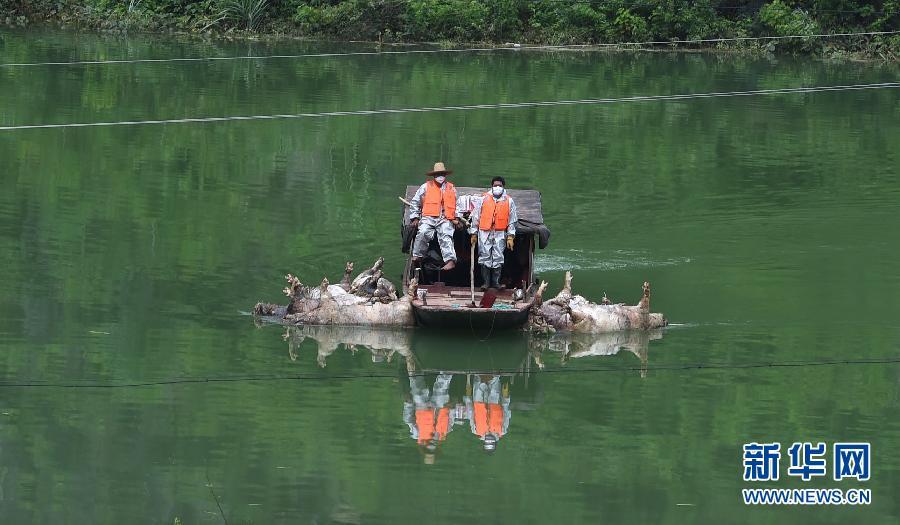 6月18日,打捞人员在广西大化瑶族自治县六也乡加司村打捞死猪。当日,广西大化瑶族自治县组织打捞队伍开始打捞死猪,已有数百头死猪被集中到填埋点附近,待填埋点挖好后将进行无害化处理。6月14日,暴雨洪灾导致广西大化瑶族自治县六也乡一养殖场被淹,1.6万头猪被淹死。新华社记者 黄孝邦 摄 图片来源:新华网