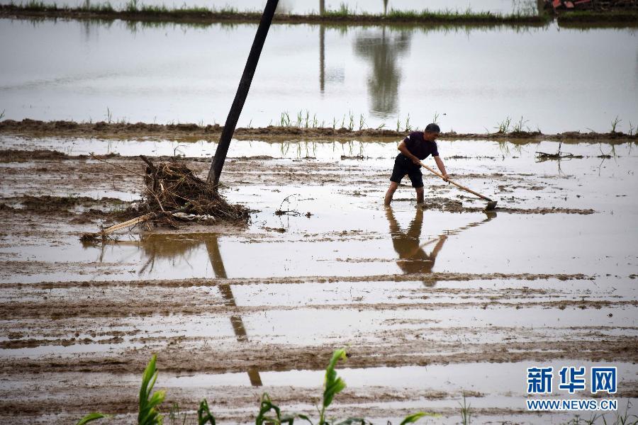 湖北省崇阳县石城镇的一位农民在被水冲毁的农田内(6月18日摄)。进入6月份以来,湖北省崇阳县遭受连续暴雨及山洪袭击,来势猛的特大暴雨造成山洪暴发,河水陡涨,1座中型水库和33座小型水库溢洪,沙坪、石城、桂花泉部分乡镇村落被淹。全县12个乡镇均不同程度受灾,全县受灾人口达11.5万人,目前确认死亡5人,失踪2人。新华社记者 郝同前 摄 图片来源:新华网