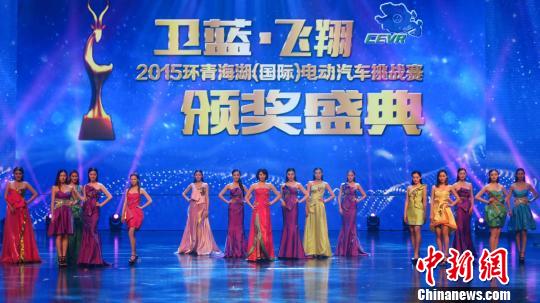 2015环湖电动车赛是世界首次电动汽车环湖专业拉力赛,也是世界第一档海拔最高的自驾竞技活动,致力于以电动汽车为代表的新能源汽车的应用与普及。图为颁奖仪式上,公布“卫蓝天使”冠亚季军。